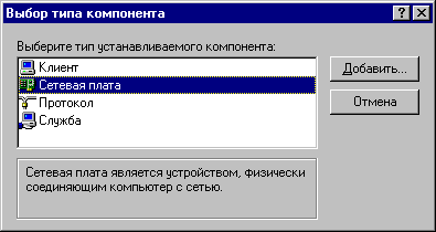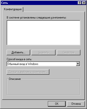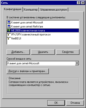 Если поддержки сети раньше не было, то появятся следующие компоненты: Клиент для сетей Microsoft Клиент для сетей NetWare NE2000-совместимая плата IPX/SPX-совместимый протокол NetBEUI Способ входа в сеть станет: Клиент для сетей Microsoft |