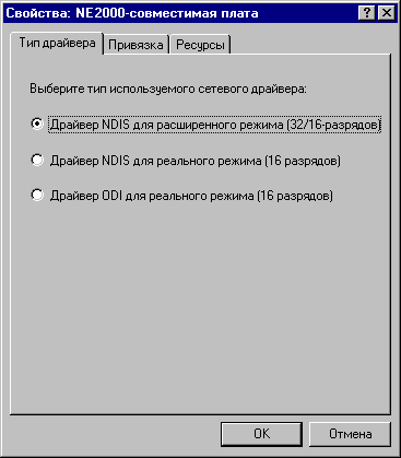 Для настройки параметров сетевой карты необходимо указать "NE2000-совместимая плата" и нажать кнопку "Свойства". |
