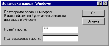 | После перезагрузки появится окно в котором надо ввести имя пользователя и его пароль. При вводе пароля вместо букв будут печататься звездочки, это так и должно быть. Если вы все набрали правильно, то нажав "OK" вы попадете в систему, а ваше имя и пароль будет использоваться при вашем доступе к другим компьютерам сети (вашей рабочей группы). Если вы нажмете "Отмена", то вы все равно попадете в систему Windows, но сетевые ресурсы вам будут недоступны. | ![]() |